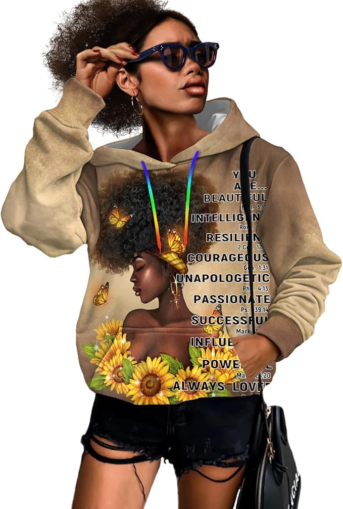Black Women Casual Hoodies African American Pullover Tops Drawstring Long Sleeve Sweatshirt for Women with Pockets