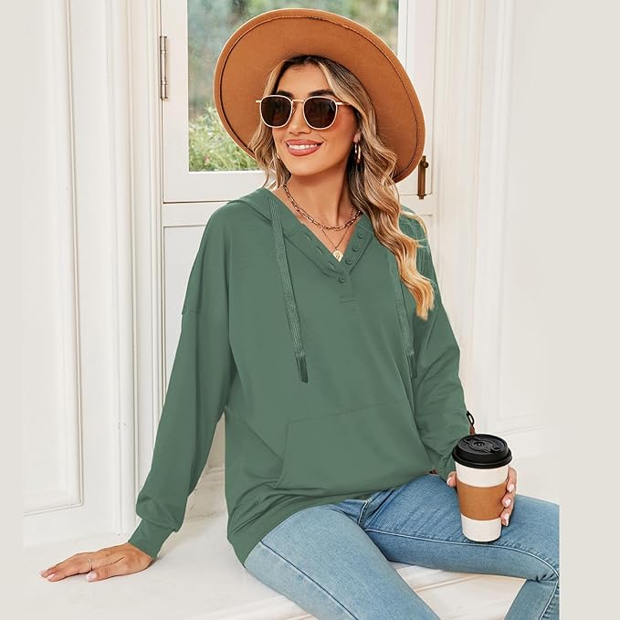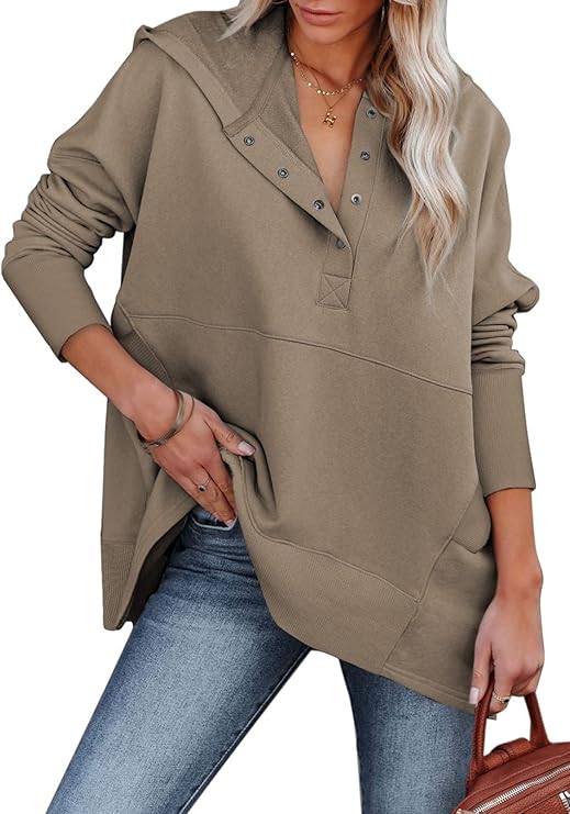 Women Casual Button V Neck Hoodies Oversized Pullover Sweatshirt Hooded Tops with Pockets